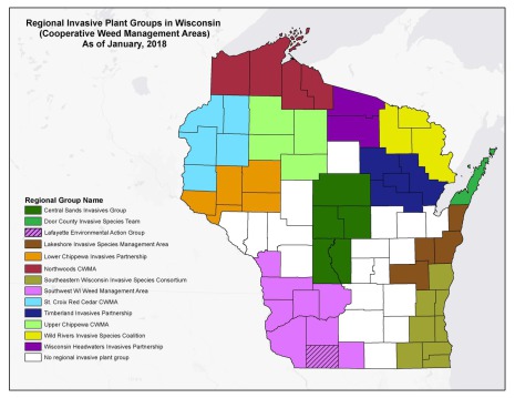 The Northwoods CWMA is one of twelve regional invasive plant groups in Wisconsin (red in the map below). Click on the map below to enlarge it. For more information visit the Invasive Plant Association of Wisconsin (IPAW)