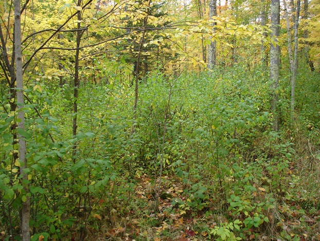 Common and glossy buckthorns, invasive honeysuckles and Japanese barberry are three groups of invasive shrubs that take-over the understory of forests. These shrubs are all ornamental and are still commonly found in yards. If you have any of these species in your yard, the NCWMA encourages you to remove them if you are able to. All of these species produce berries that birds eat and spread the seeds into local forests. So even if the bush is contained in your yard, it may be transported to forests in the area.