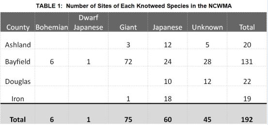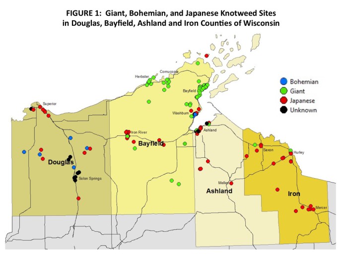 Since 2008, the Northwoods Cooperative Weed Management Area (NCWMA) and its partners have been tracking and treating invasive knotweeds within its region which includes Ashland, Bayfield, Douglas and Iron Counties in northern Wisconsin (Figure 1). Invasive knotweeds that occur in the area include Japanese knotweed (Fallopia japonica), Giant knotweed (F. sachalinensis), and their hybrid, Bohemian knotweed (F. X bohemica). Work has focused in the Bayfield Peninsula as nearly half of known occurrences are located in that region. The number of sites treated per year has varied and consistency in treating and monitoring sites has been a challenge. This project focuses on evaluating the effectiveness of treatments over the years. To prioritize future treatments of sites, sites were classified by basic features such as land ownership, population size, proximity to water, whether they are in landscaped areas (yards), and whether they are near or in forests. Occurrences in yards may have little ecological threat, however, they are difficult for landowners to treat on their own and have the potential to damage foundations and pavement. Other occurrences are more of an ecological threat as they have spread to shorelines, roadsides, stream banks and ravines.