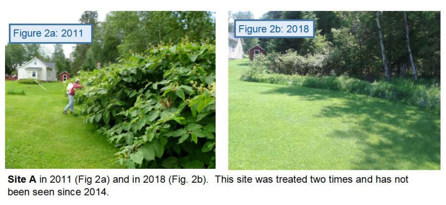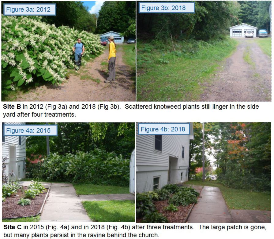 No plants were found at nine knotweed sites in 2018 after 1 to 3 treatments completed previous years. Typically the treatments were completed once per year. Five of these sites were small when first discovered, while three were medium sized. However, one site (Figure 2a & b) was a large, dense population that was treated two times and has not been seen since 2014. Eleven other sites had a significant decrease in size after one or two treatments.