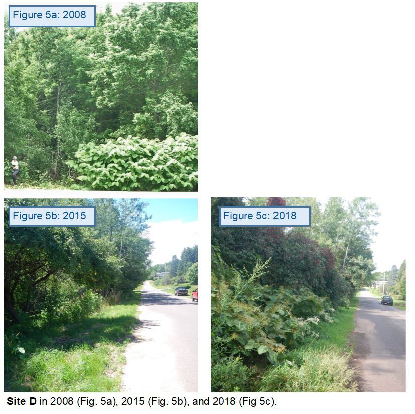 Eleven knotweed sites have been treated three to five times and have a minimal decrease in size when visited in 2018 compared to their pre-treatment size. A few of these had decreased after multiple years of treatments, but treatments were inconsistent in recent years and the knotweed rebounded. Some of these are very large with multiple patches. Some years the entire population may not have been thoroughly treated. Site D (Figures 5a, b & c) was treated starting in 2008. By 2015, Site D had been treated four times and was much smaller with scattered patches. Site D has not been treated since 2015. In 2018, the site is not as big as 2008, but it once again is a very dense and large population.
