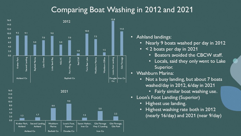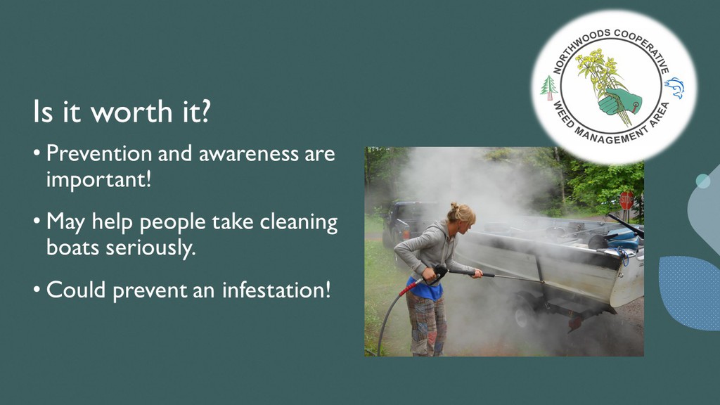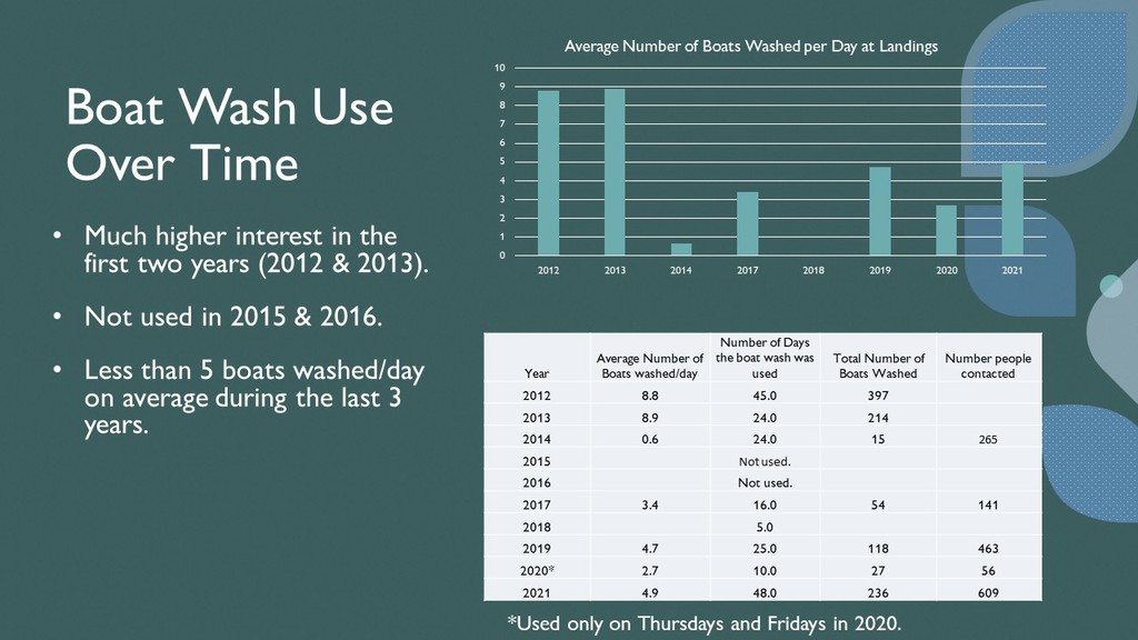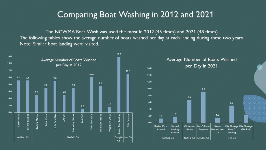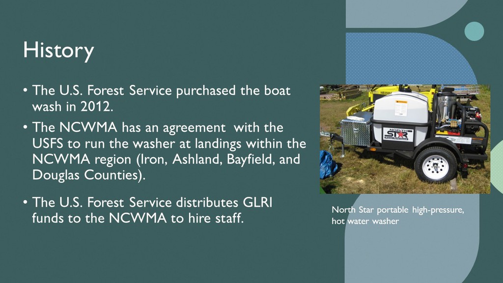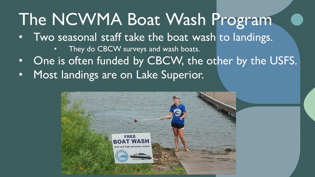 The NCWMA manages a high pressure, hot water boat wash at boat landings. The boat wash has been used throughout the NCWMA region since 2012. In 2021, we were able to get it to landings 48 days. This year, NCWMA staff decontaminated 236 boats and talked with 609 boaters about the importance of decontaminating boats before and after entering water bodies to stop the spread of invasive species. Here is a summary of this program.